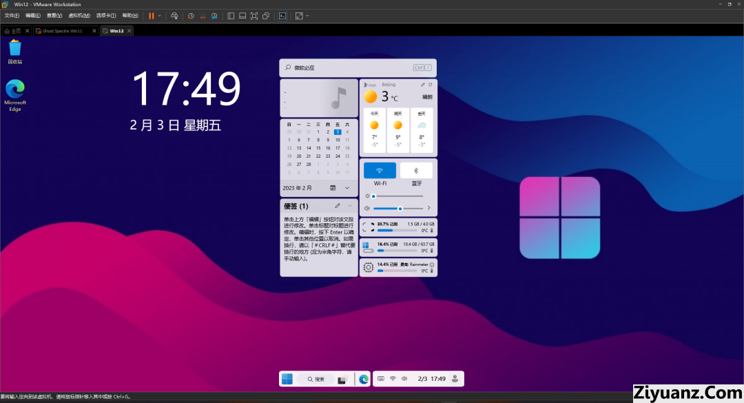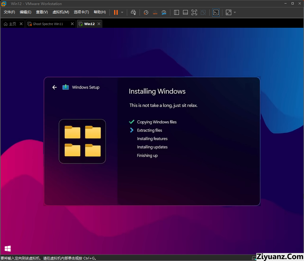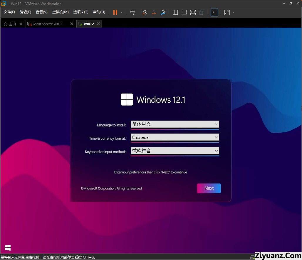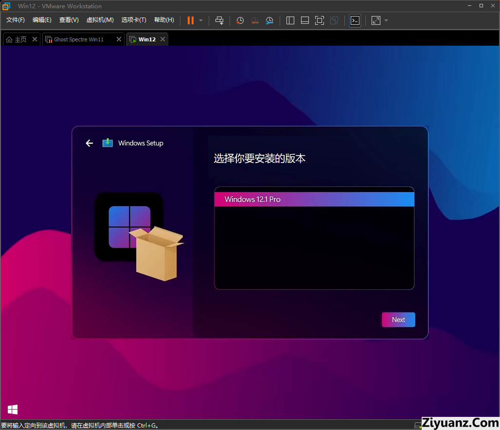 这个 Win12 概念版镜像没有带引导启动,需要通过 PE 系统,再挂载镜像,之后运行 Setup.exe 开始安装。下面采用虚拟机安装,可以看到安装界面也还原了概念版视频。